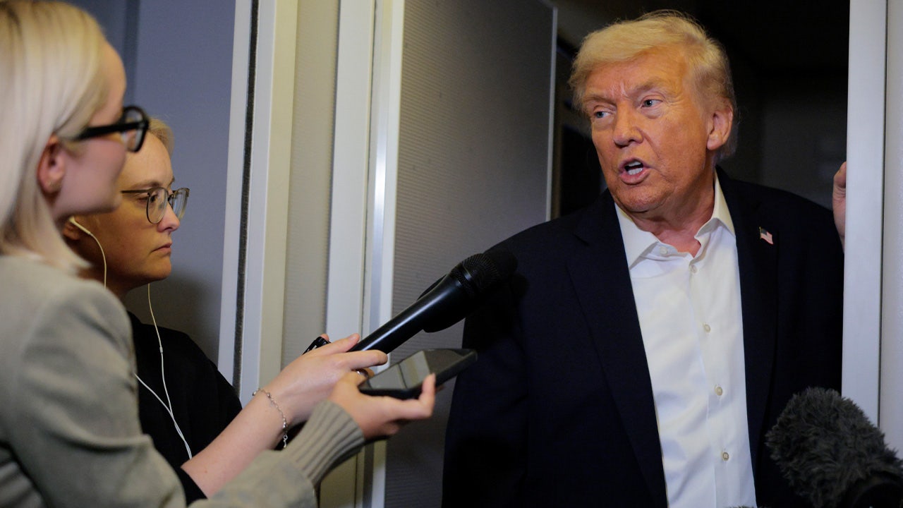 President Donald Trump speaks to the media aboard Air Force One before departure from Royal Air Force Mildenhall on October 14, 2025 in Mildenhall, England. (Chip Somodevilla/Getty Images)