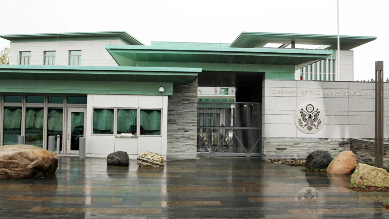 The main entrance is pictured at the U.S. Embassy in Norway. A former security guard there was sentenced this week for spying for Russia and Iran, a report said. (U.S. Embassy in Norway )