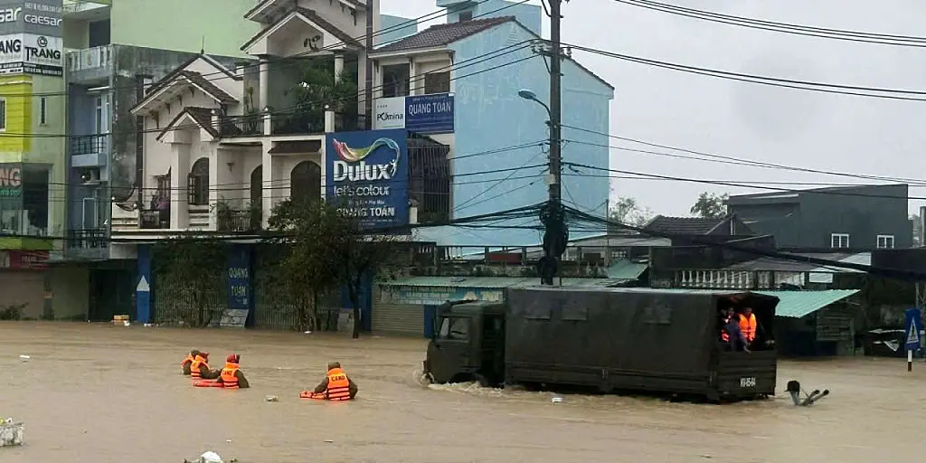 An officer from the Gia Lai Provincial Police can be seen taking the infant from the mother before wading through thigh-deep water to reach a rescue vehicle. The officer used his helmet to shield the child from the driving rain.