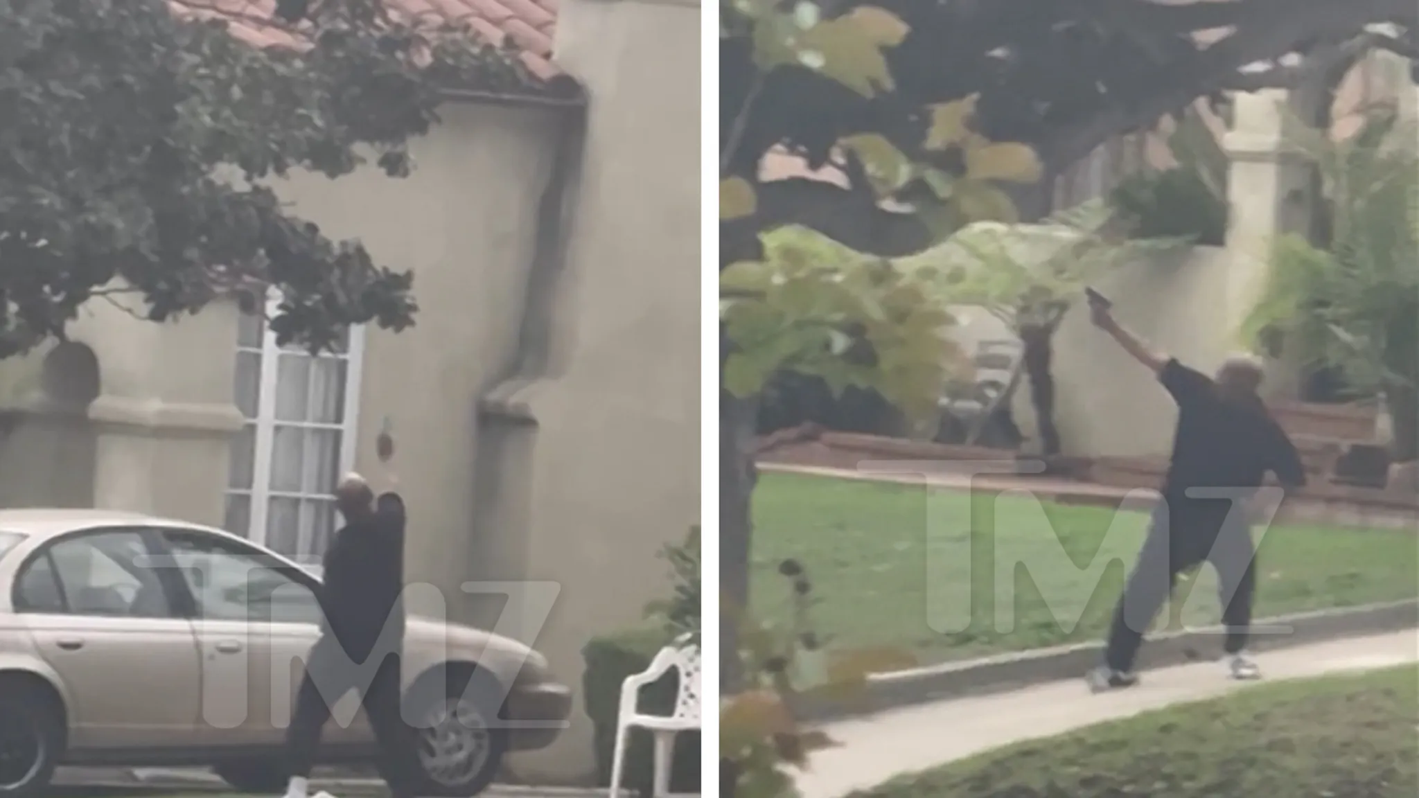 In the footage, you see a man dressed in black pacing menacingly around the front yard of a home on West 76th Street … and he flashes a handgun as the sound of a police helicopter circles overhead.