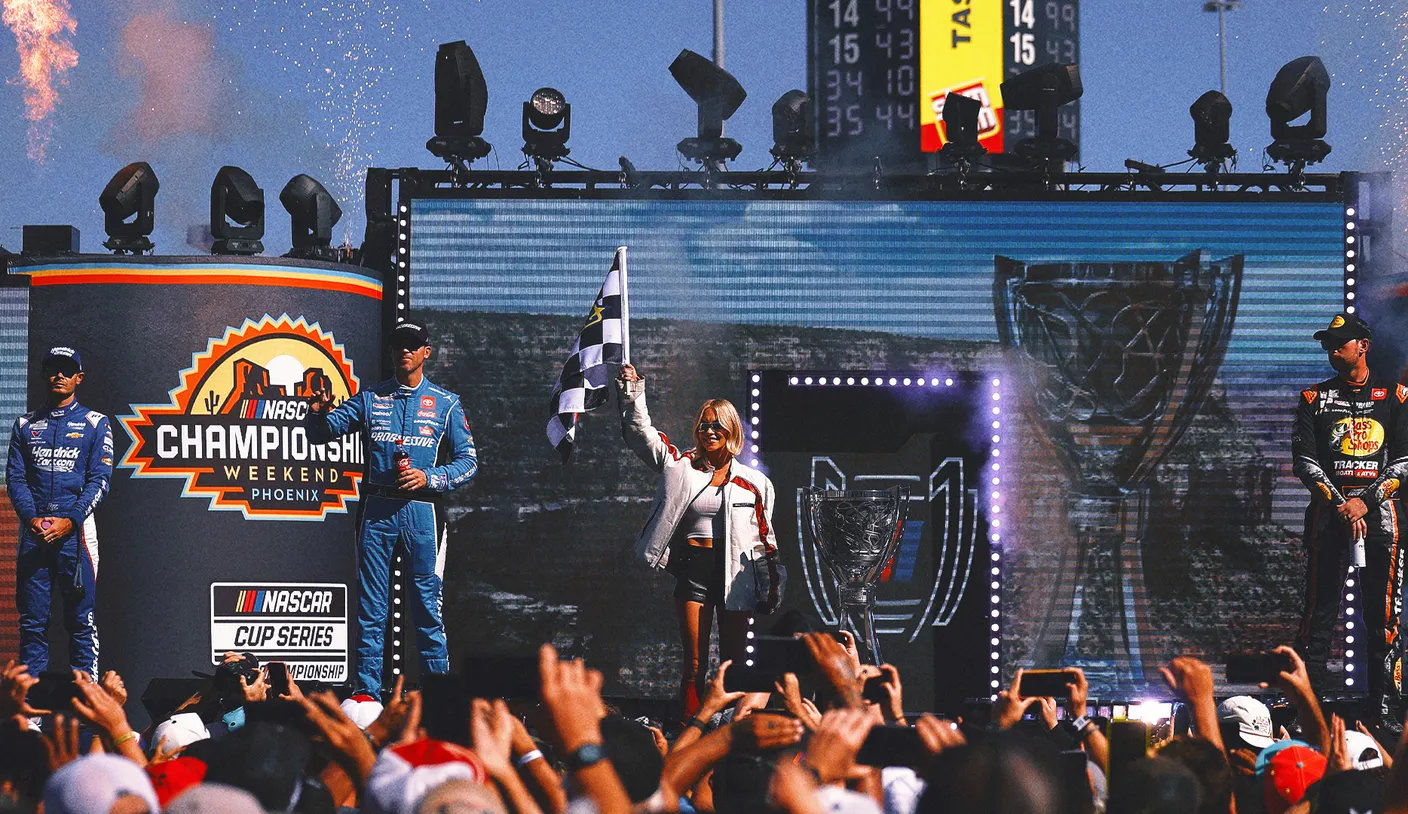Kyle Larson celebrates after winning the NASCAR Cup Series championship at Phoenix in 2025.