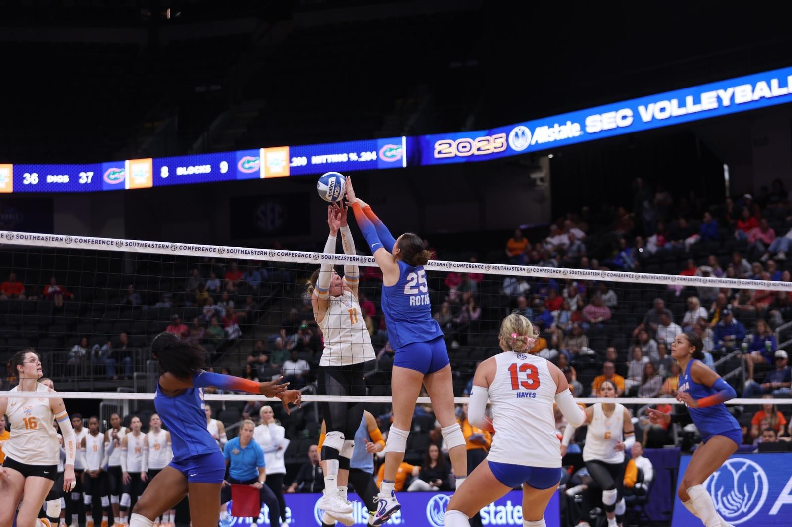 SAVANNAH, Ga. – After winning the opening set, the No. 5 Florida volleyball team was defeated by No. 4/18 Tennessee in four sets, 27-25, 25-27, 22-25, 19-25, in the quarterfinal round of the SEC Volleyball Tournament Presented by Allstate on Sunday night at Enmarket Arena.