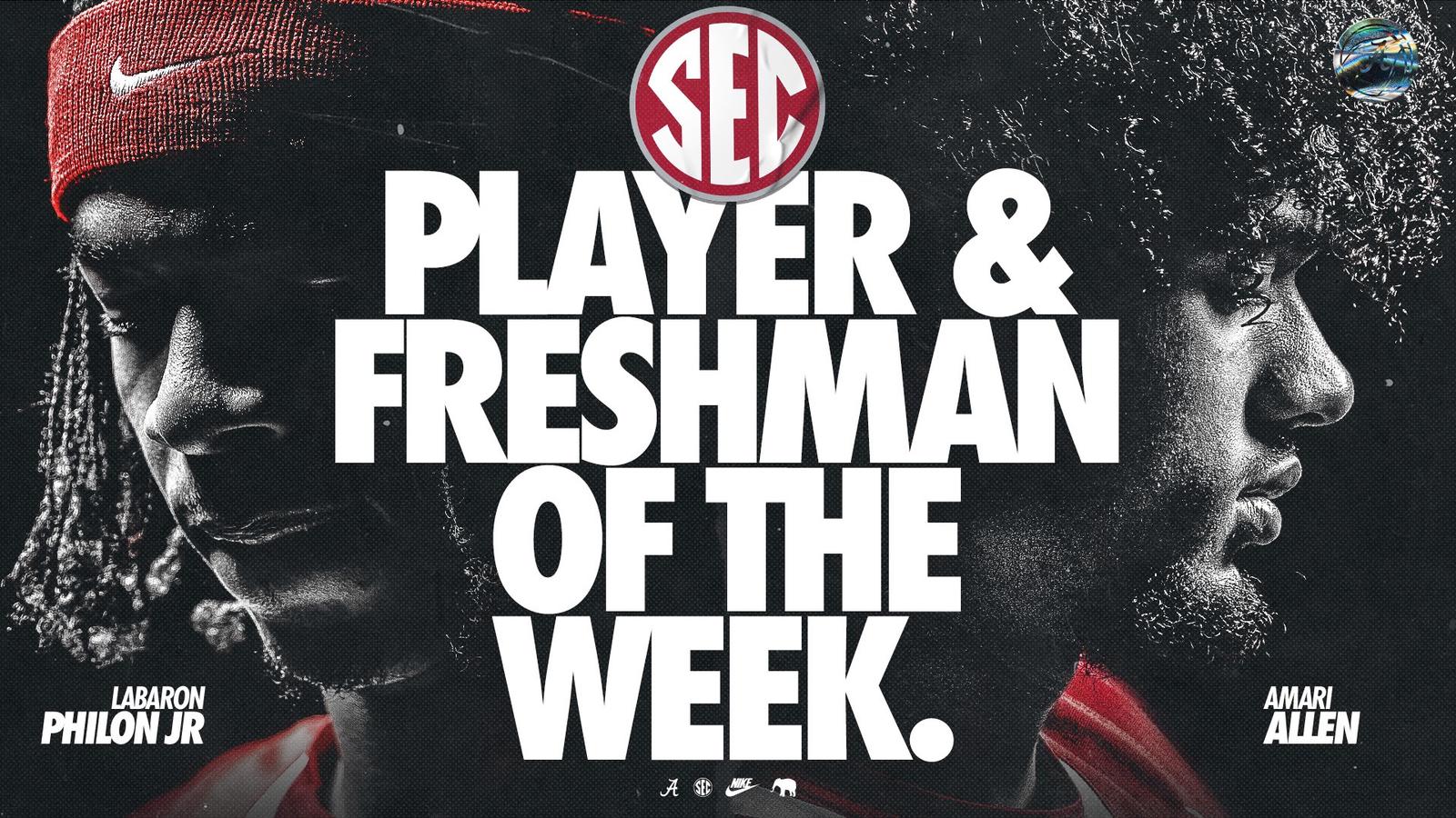 TUSCALOOSA, Ala. – Alabama men’s basketball duo swept the Southeastern Conference weekly honors, as Labaron Philon Jr. was named the SEC Player of the Week and Amari Allen was named SEC Freshman of the Week, the league office announced Monday morning.