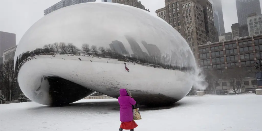 CHICAGO, ILLINOIS – FEBRUARY 12: People visit the Cloudgate sculpture as a winter storm passes over the city on February 12, 2025 in Chicago, Illinois.