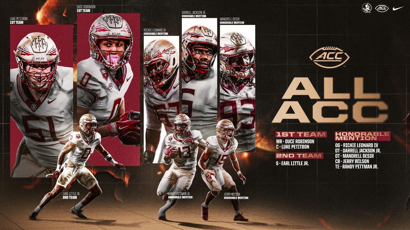 TALLAHASSEE – Eight FSU football student-athletes were recognized on the 2025 All-ACC teams announced Tuesday, led by first-team selections Duce Robinson and Luke Petitbon.