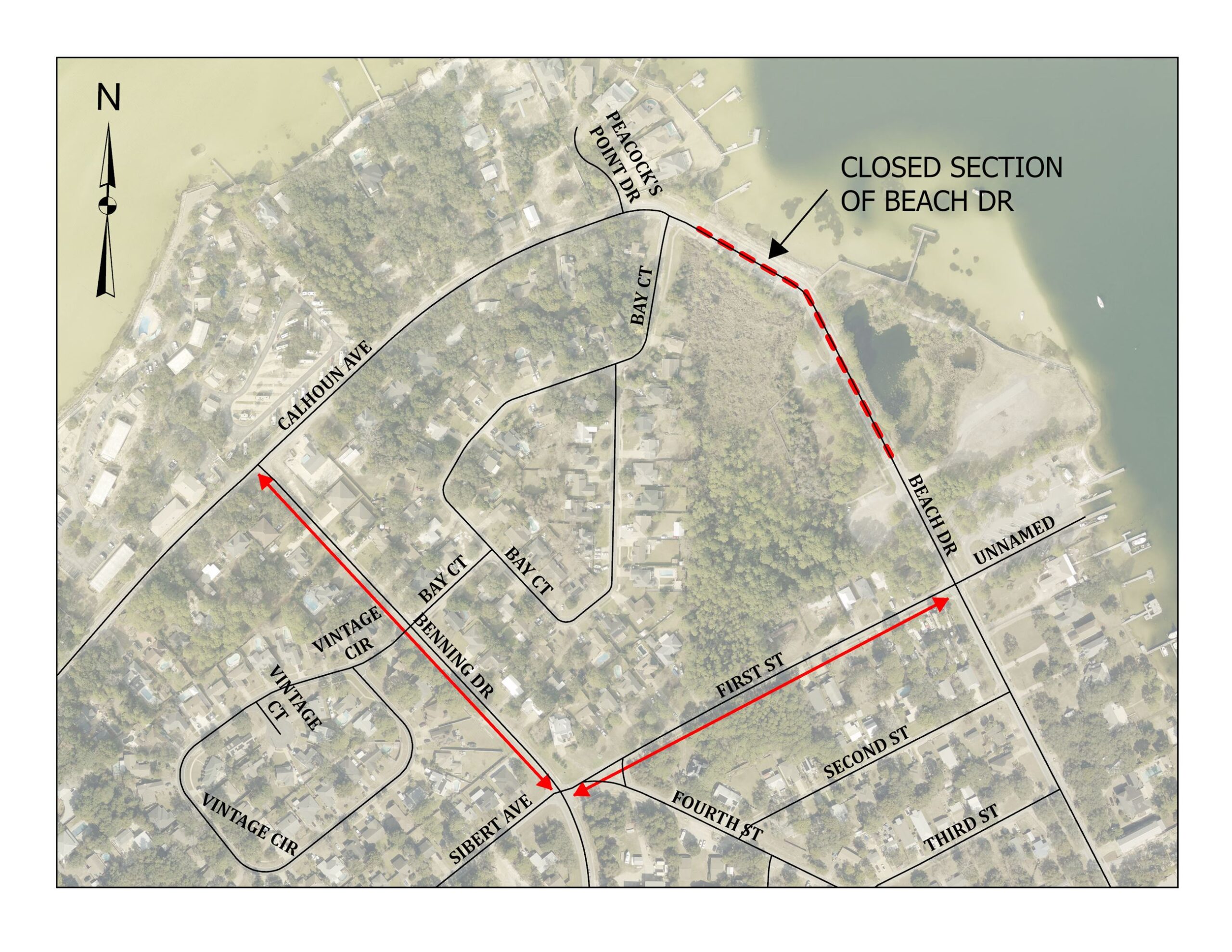 The City’s contractor, RBM Contracting Services, for RFB 25-13-PW will close Beach Drive between First Street and Bay Court on Monday, 12/15/25 in order to begin construction on the replacement of the culvert under Beach Drive. This $548K project is expected to take approximately two months. During this time, the fishing pier at Mattie Kelly will not be accessible and no traffic will be allowed through the project. The detour route is First Street and Benning Drive. We appreciate your patience and understanding while the roadway is closed.