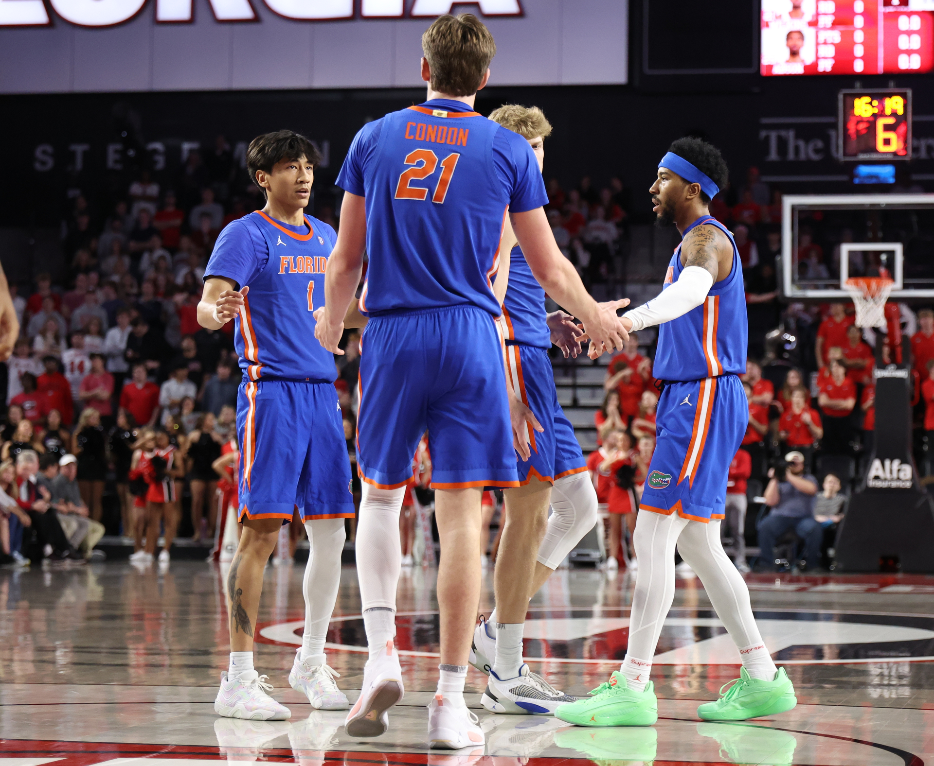 About the Gators: They’re back at home for the first time in 13 days, with the last O’Dome appearance the 100-77 blowout of 23rd-ranked Alabama, which marked the second win of the current four-game streak during which the Gators have defended opponents at an aggregate 33.7% overall and 29.1 from the 3-point line. … UF’s most lopsided win at Georgia since 2000 came about through 51% shooting from the floor and by hitting their season’s SEC-high of 10 from the 3-point line on 26 attempts (38.5%). The Gators won by 20 despite the Bulldogs staying close on the glass (42-35, including 13-9 on the offensive end), where UF ranks No. 1 in the nation in rebounding margin at plus-15.2. … Speaking of rebounds, center Rueben Chinyelu, the SEC leader in the category, grabbed 20 against Georgia to become just the third player in program history to reach 20 in a league game. Over the last three games, Chinyelu has averaged 17.7 boards and is furthering his cause for SEC Defensive Player of the Year. He’s now the nation’s No. 1 defensive rebounder (31.8%) and No. 6 offensive rebounder (18.2). … Guard Xaivian Lee had an elite floor game at Athens, finishing with 18 points, seven assists, no turnovers and three steals in 32 minutes. Backcourt mate Boogie Fland added 15 points. The two combined to go 14-for-27 from the floor overall, including 10 of 12 in the 2-point area. As for the 3-point area, Lee equaled his SEC season high with three makes, while Fland snapped a stretch of 18 consecutive misses, spanning eight games, when threw in a late-shot clock 3 in the second half. In conference play, Lee is hitting 25.8 from the arc and Fland 13.5. They’re 61.0 and and 57.0, respectively, from the 2-point area. … Forward and scoring leader Thomas Haugh didn’t hit a field goal through the first 23 minutes, yet the Gators won going away, which says something about their depth. … Forward Alex Condon had 10 points, five rebounds and three steals, but also a career-high seven turnovers at Georgia. His defense remained elite throughout his mistakes. … Backup guard Urban Klavzar (9.8 ppg) is up to 41.7% from the 3-point line in conference play, which has helped the Gators inch to 30.6 collectively. The shooting of backup guard Isaiah Brown (5.4 ppg) hasn’t hurt, either. Brown scored 12 points and drained a career-best three 3s in 16 high-end minutes against the Bulldogs and is now shooting 51% overall and 8-for-19 from the arc (42.1%) in league play. … Reserve center Micah Handlogten (4.5 ppg, 6.0 rpg) actually has a better offensive rebounding percentage (21.6) than Chinyelu, but doesn’t have the minutes (14.7 per) to qualify for the stat.