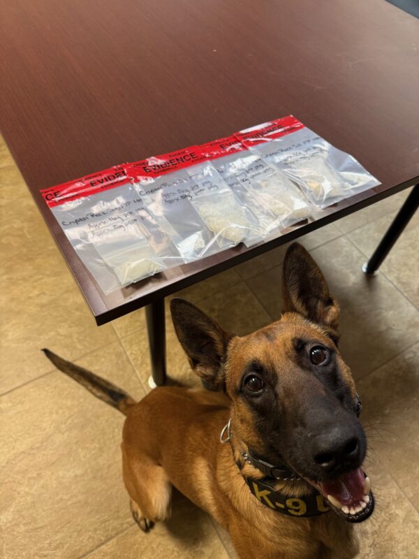 Moments later, K9 Deputy Caden Downing arrived with K9 Vojak. During a free-air sniff around the vehicle, Vojak alerted to the odor of narcotics. That alert led to a probable cause search of the truck.